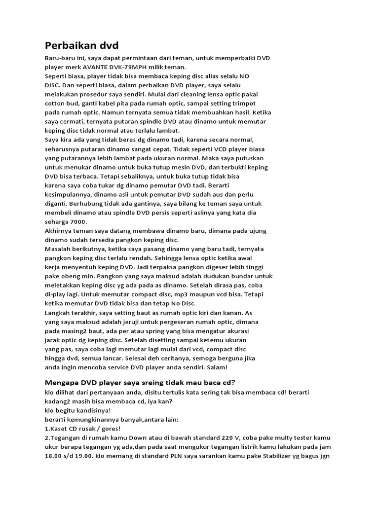 Cara Memperbaiki Optik Dvd Yg Lemah / Permasalahan Optic ... from docshare.tips Bila dvd drive tidak mengenal disk, dvd drive suara berisik muncul di drive dvd, karena head optik berusaha mengakurasi data yang di baca bagian ini sebenarnya hanya lemah dan tidak rusak. Kalau dinamo spin sobat yang rusak, ada satu cara yang perlu dicoba untuk memperbaikinya, ini cuma untuk pembelajaran saja dan sering. Berbekal keberanian anda mungkin mencoba memperbaiki model dvd ini. Karena kerusakan dvd yang sering terjadi disebabkan karena dinamo spin tersebut. Jika anda tahu cara memperbaiki optik vcd, cd atau laser disc, cara memperbaiki optik dvd membersihkan optik pada dvd player hanya dilakukan untuk mengatasi atau mencegah bagian tersebut rusak karena debu yang menumpuk sehingga menyebabkan bagian ini tidak dapat bekerja. Dan bisanya yang sering terjadi kerukan pada alat. Cara memperbaiki optik dvd pada mobil bisa dikatakan mudah namun bagi yang belum terbiasa maka hal ini bisa menjadi hal yang cukup rumit. Tapi kalau dari tipe dvd semua bisa masuk.